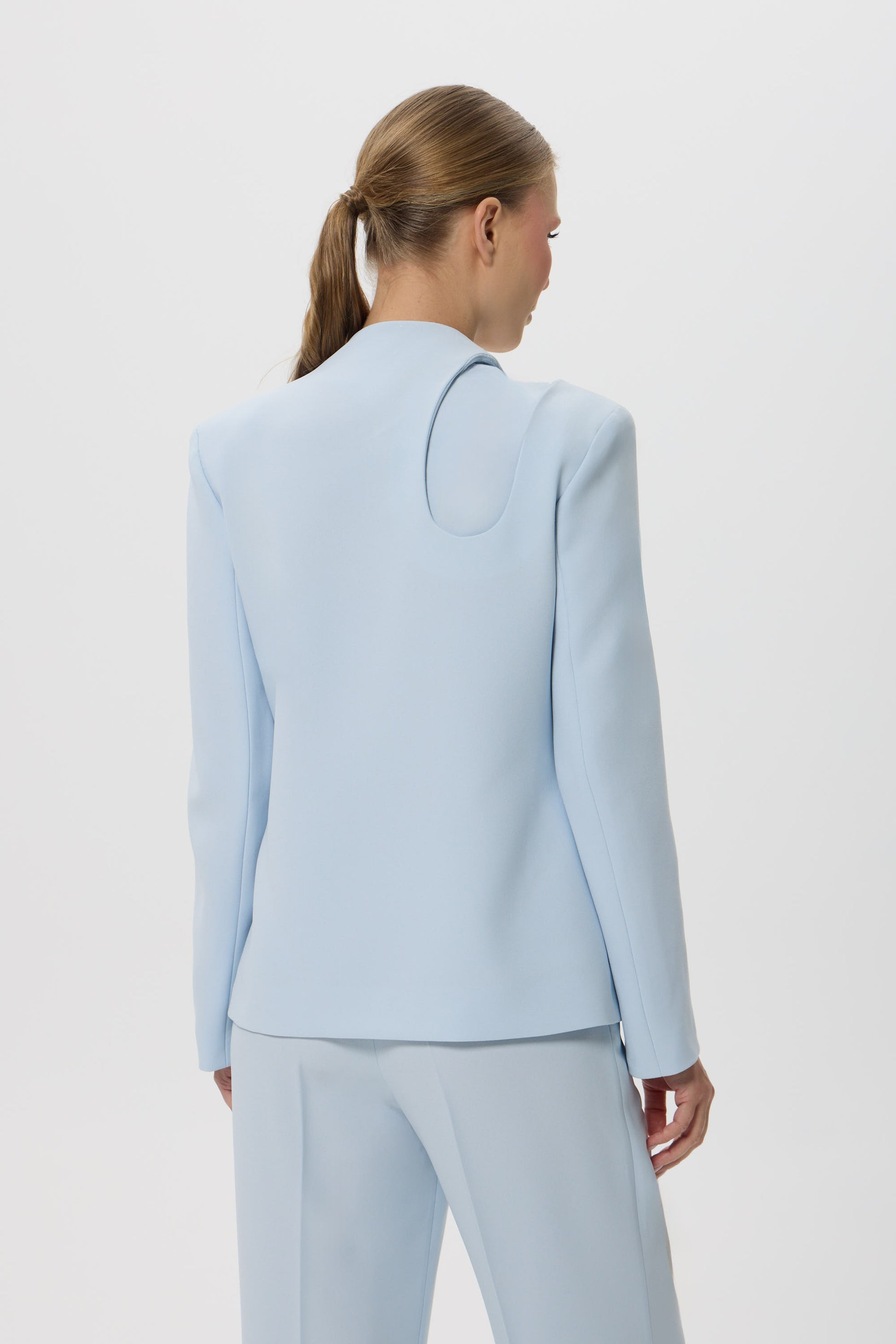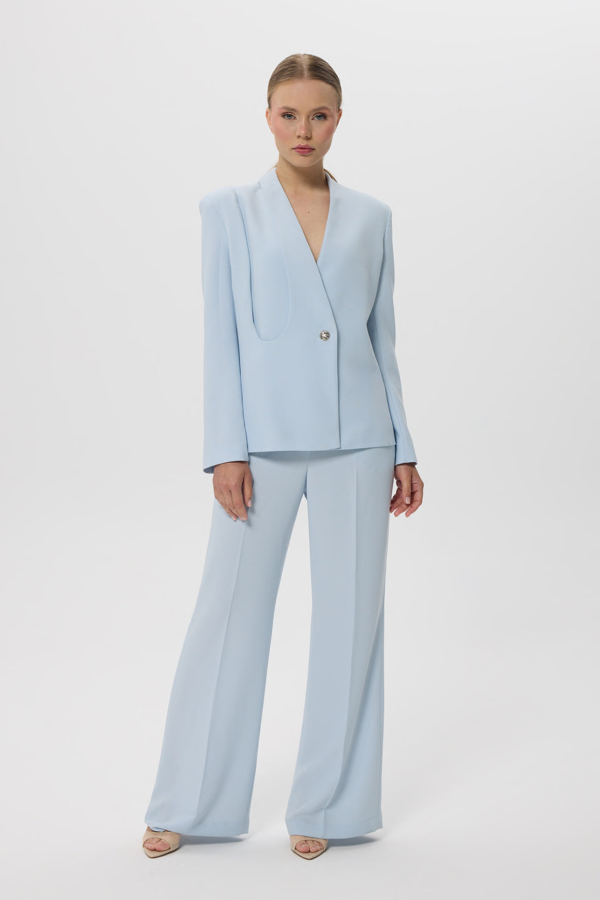 The Azure Set is crafted from lightweight Italian crepe, showcasing a modern, single-breasted design with a sleek, collarless neckline. A defining feature is the distinctive curvy detailing on the right side of the blazer, achieved through a refined tailoring technique that creates a stunning 3D effect. This sculptural precision enhances the silhouette, providing a unique and artistic flair. Fully lined for a polished finish, the blazer is perfectly complemented by tailored straight-leg pants, creating in a sleek and sophisticated ensemble.