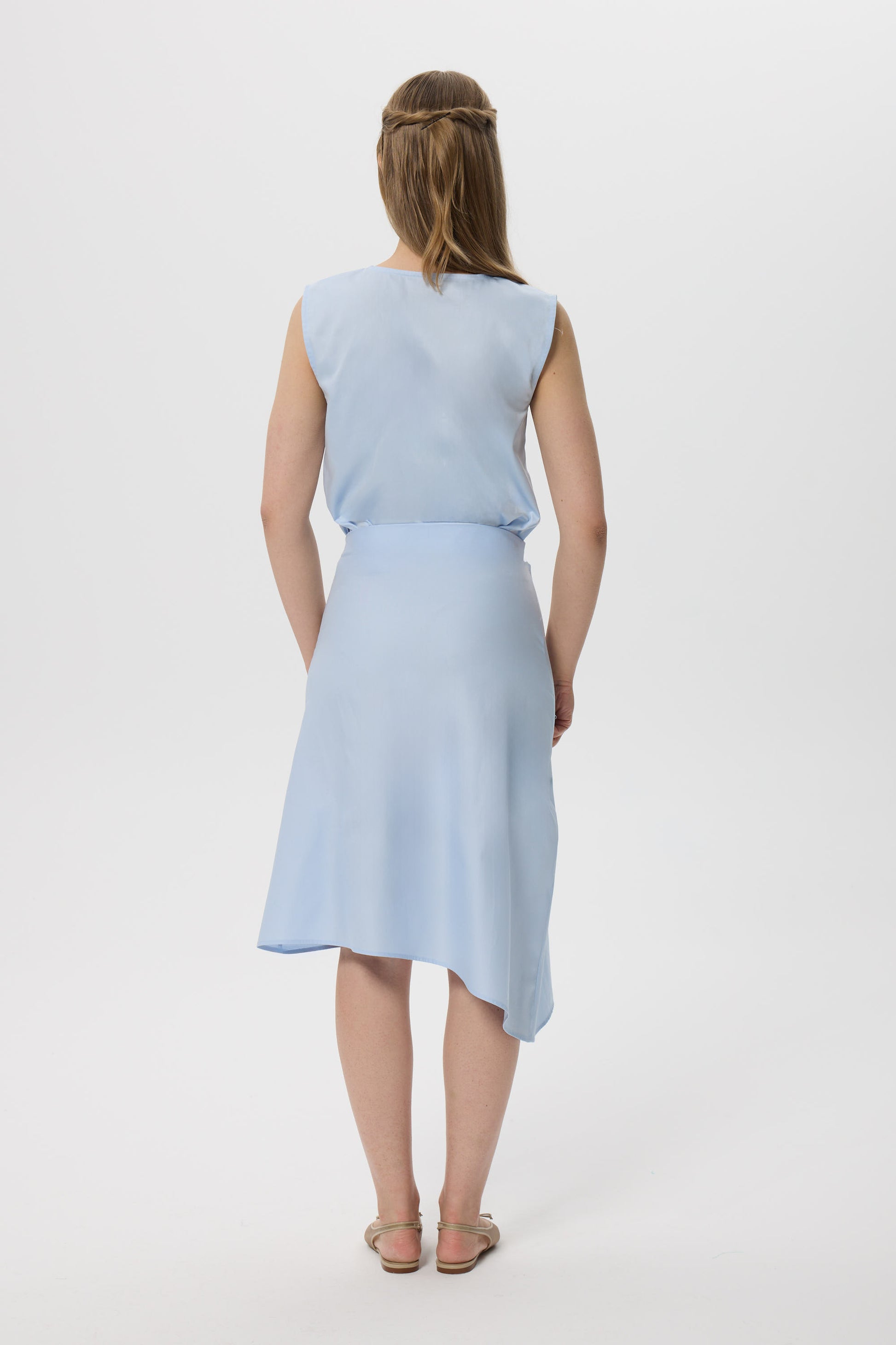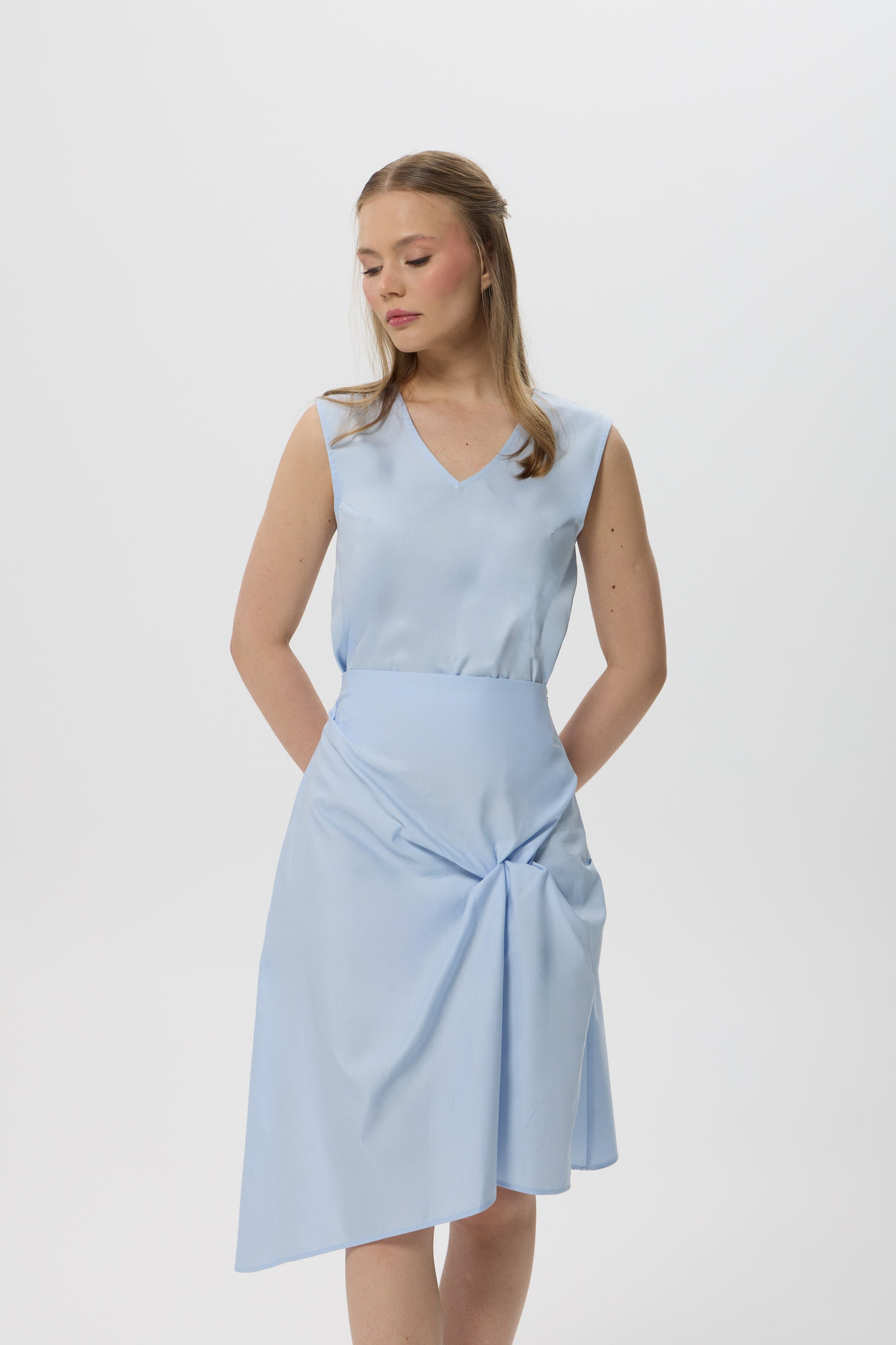 The Enigma Set in baby blue is expertly crafted from 100% Poplin Satin Cotton. This luxurious fabric offers a silky-smooth touch and a refined drape, ensuring breathable comfort. The set features a clean, sleeveless top with a classic V-neck, paired with a skirt designed with a distinctive knotted, wrapped effect that creates a unique silhouette and adds an element of intriguing dimension