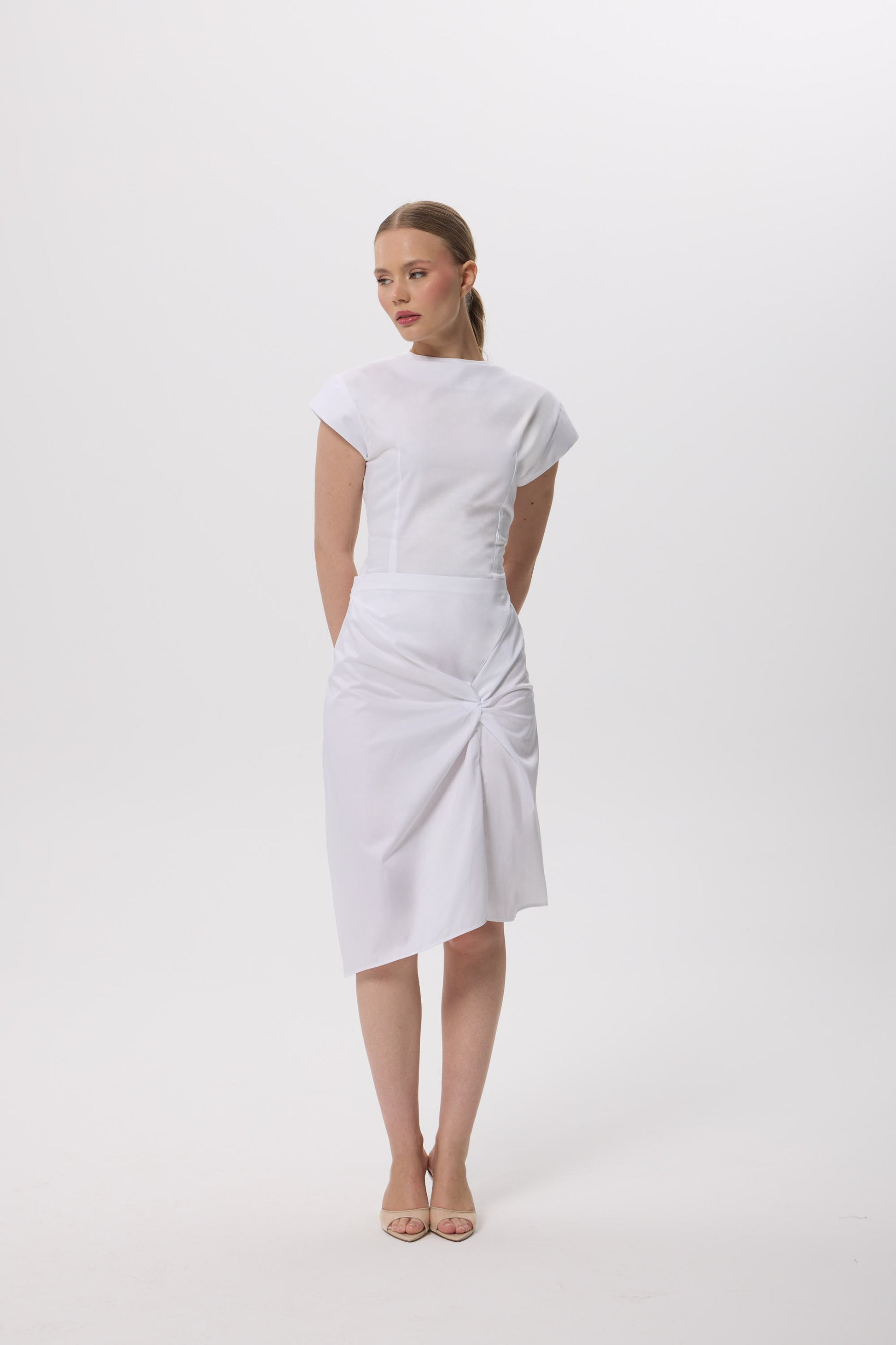 The Enigma Set in white is expertly crafted from 100% Poplin Satin Cotton. This luxurious fabric offers a silky-smooth touch and a refined drape, ensuring breathable comfort. The set features a clean, top with a round neck, paired with a skirt designed with a distinctive drappage, wrapped effect that creates a unique silhouette and adds an element of intriguing dimension