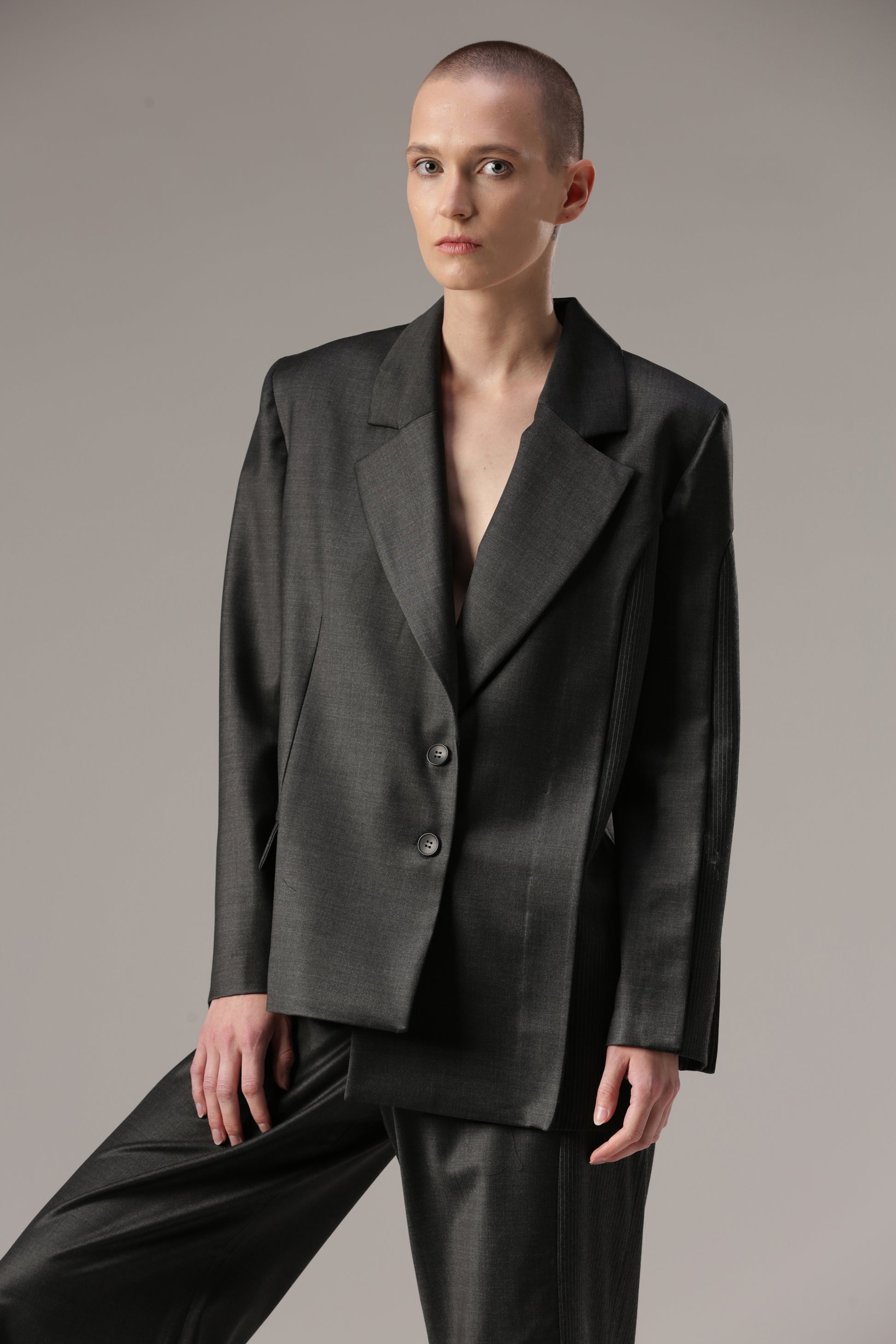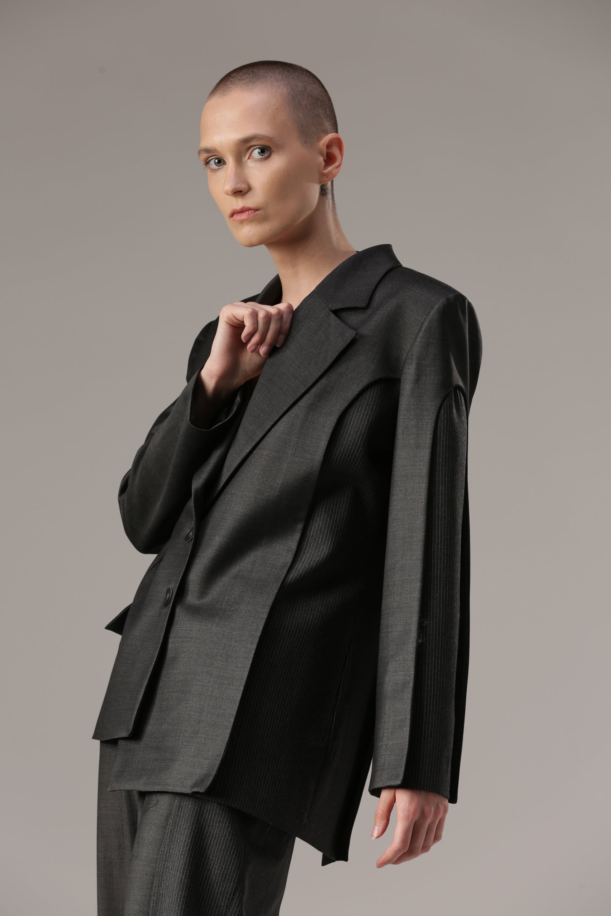 The Forte Blazer features a double-breasted fit with a tailored standard collar and an asymmetrical hemline that adds a touch of uniqueness. The left side of the jacket and sleeves showcase a special effect, blending different types of textiles for a bold contrast. It includes one side pocket and a flap pocket on the opposite side. Fully lined, this blazer ensures a sophisticated and polished finish.