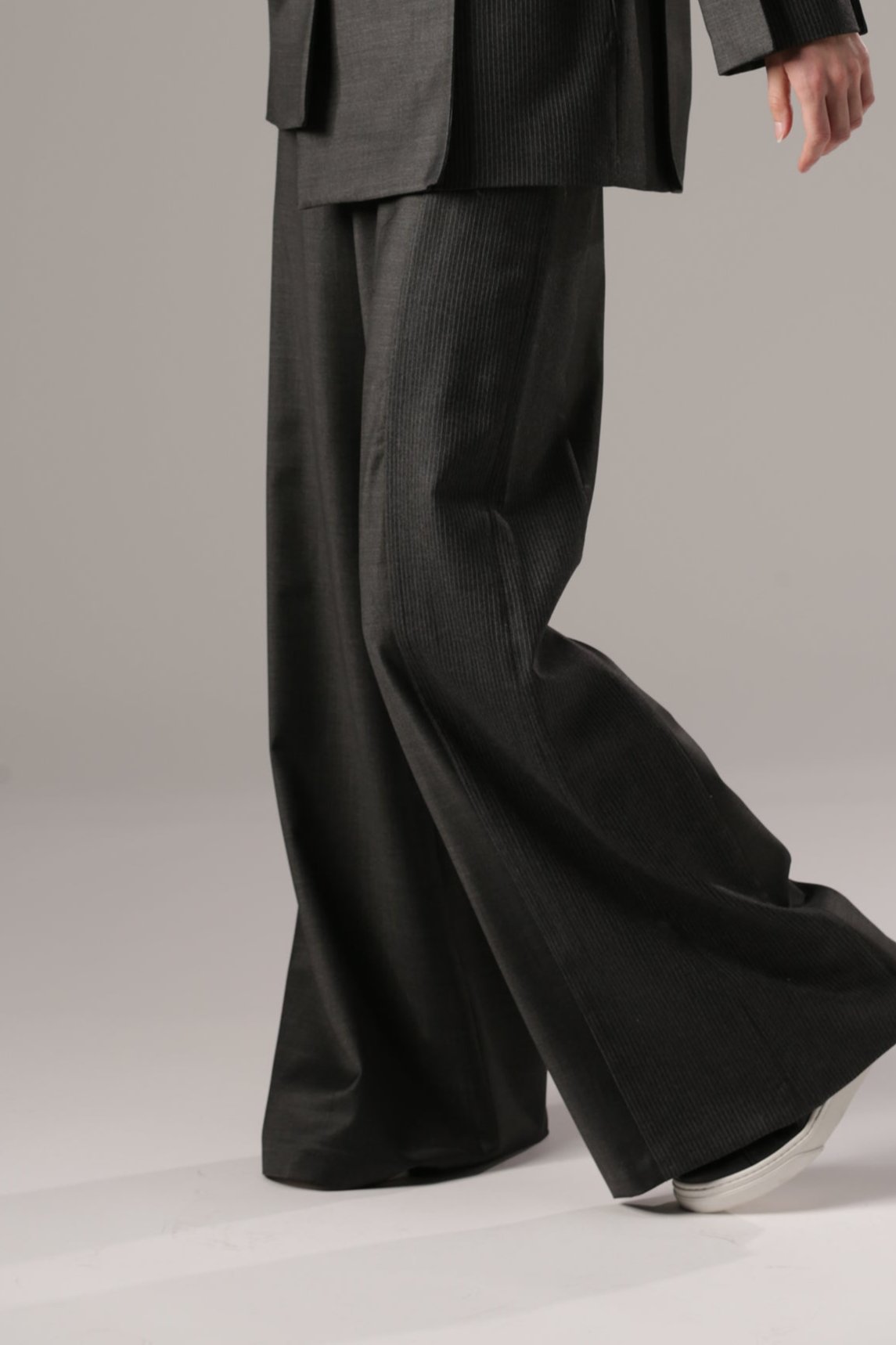 The Forte Pants feature wide-leg tailored trousers with a 5 cm belt and button closure. Designed with two pockets and a distinctive curvy cut on one side that mixes different textiles, these trousers offer a unique and stylish look. The hemline is elegantly folded and handstitched, reflecting expert craftsmanship.