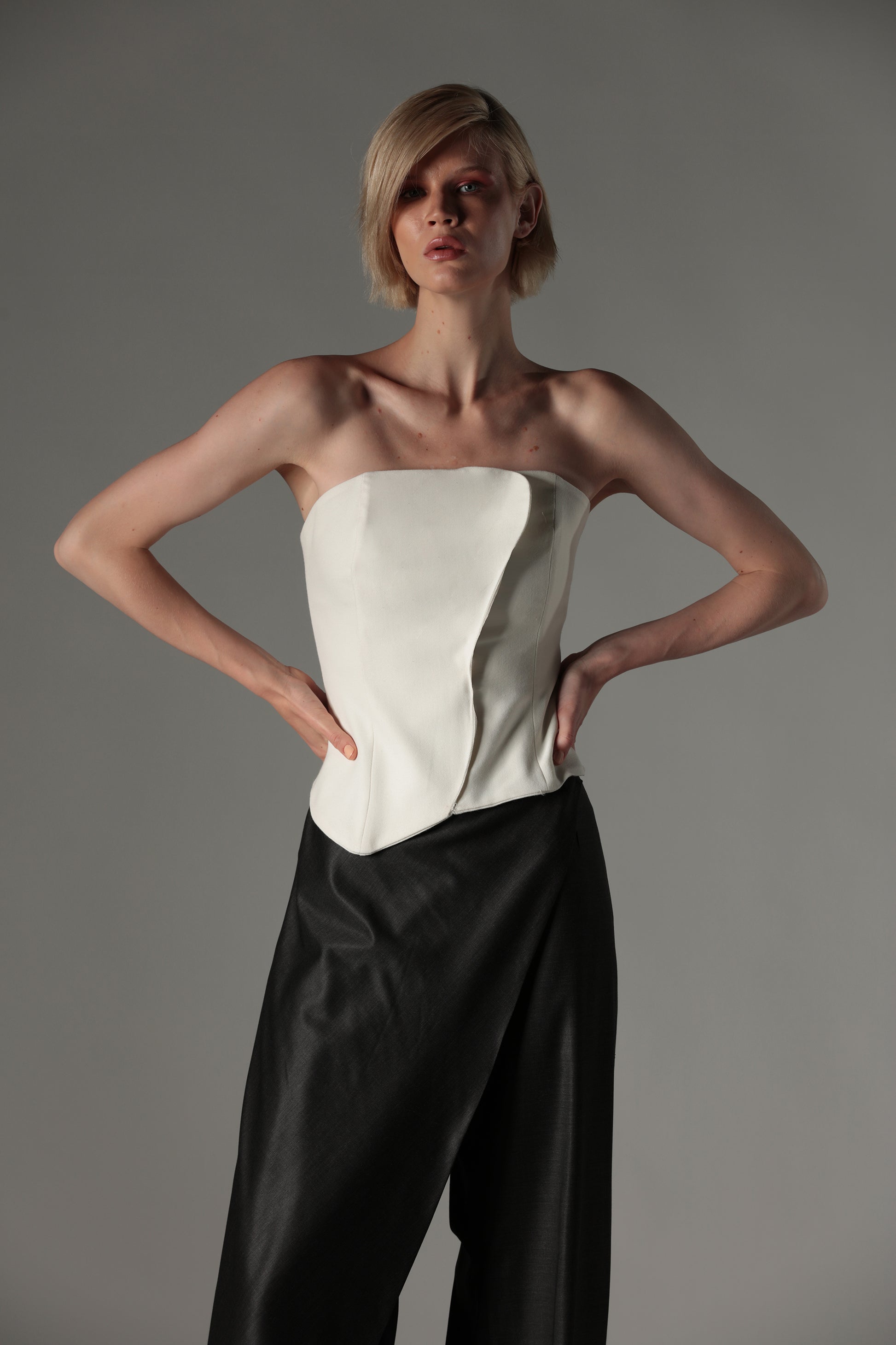 This structured 3D corset is crafted from a mid-weight suited fabric, offering a blend of elegance and durability.Curvy asymmetrical hemline. The corset is fully boned for added structure and support, with both layers crafted from the same fabric to ensure a sleek and refined finish.