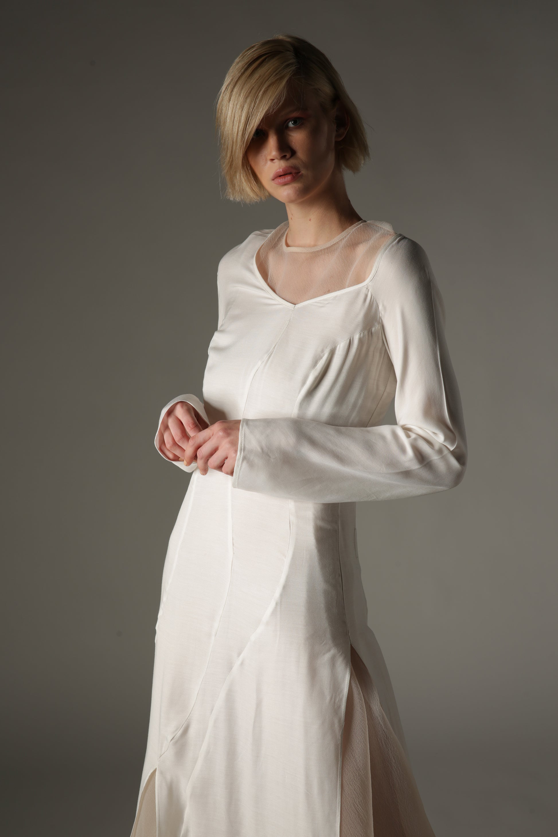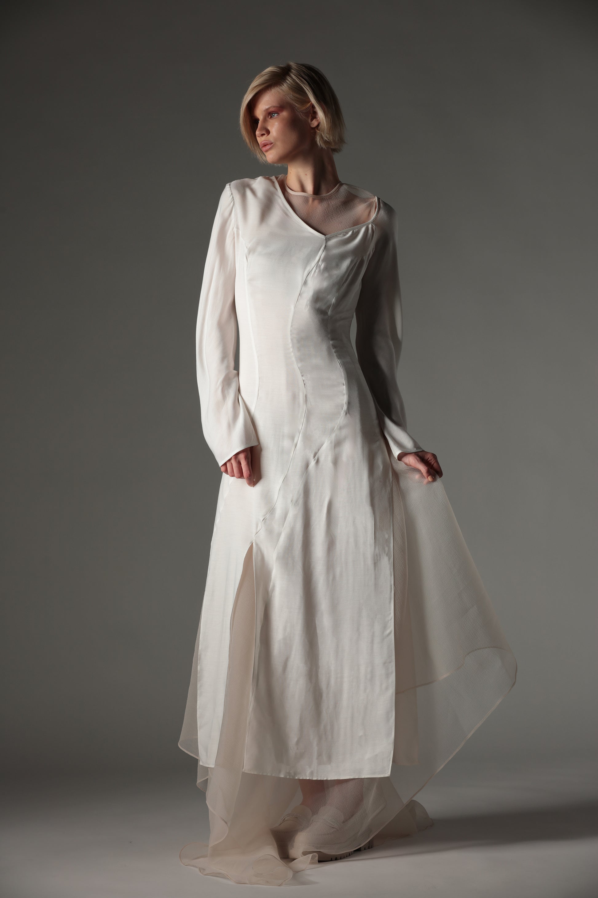 The Vivant Dress is crafted from silk, featuring an asymmetric collar . It showcases three curvy cuts in the front and back to enhance movement. With slits effect. A hidden curvy zipper completes this fluid, sophisticated design.